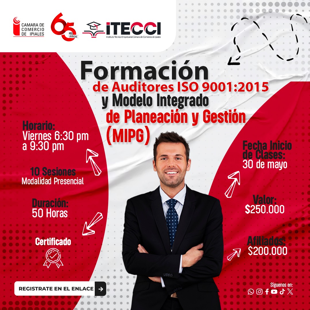 | $250.000La Cámara de Comercio de Ipiales y su Instituto Técnico Empresarial invitan a empresarios, profesionales y público en general a participar en el curso de Formación de Auditores en la Norma ISO 9001:2015 y el Modelo Integrado de Planeación y Gestión (MIPG), diseñado para fortalecer las competencias en sistemas de gestión de calidad y herramientas clave de planeación estratégica en el sector público y privado.